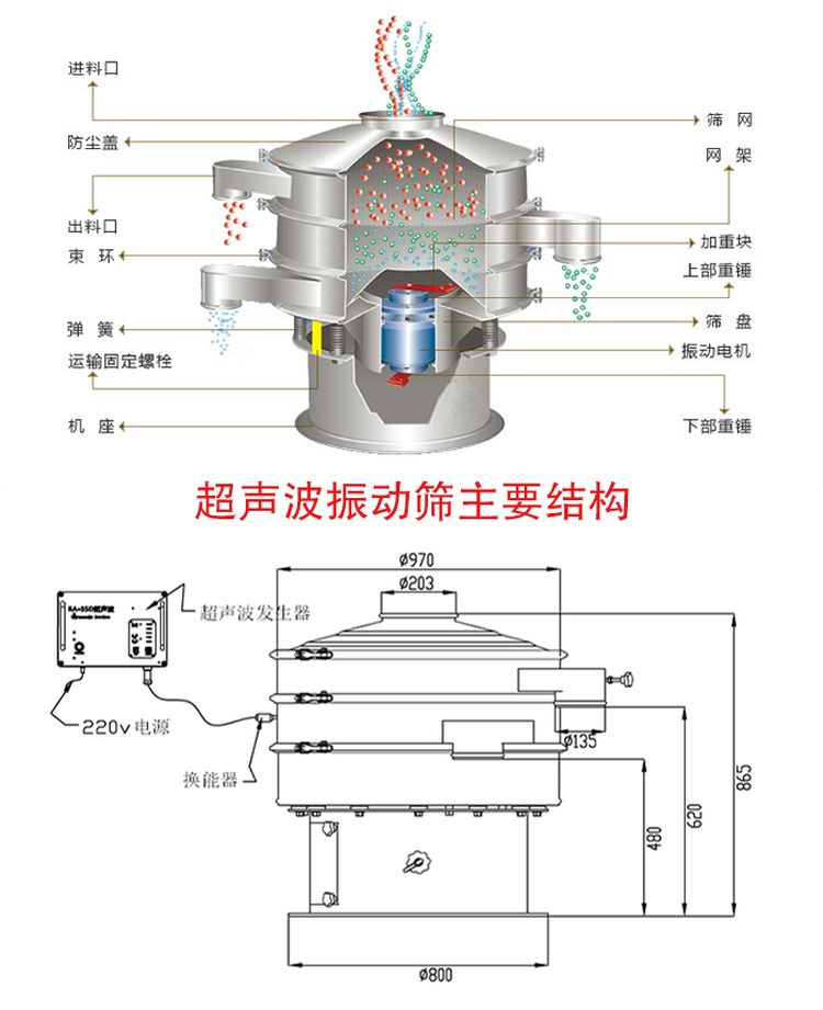 超聲波振動篩主要由換能器、超聲波電源、振動電機、減震彈簧、防塵蓋等部分組成。超聲波振動篩可將各種常用的低頻電能轉化為高達38KHz的高頻電能,再通過超聲換能器,zui終得到一個38KHz機械振動,既能夠提高篩分精度,又可以減少物料的堵網(wǎng)現(xiàn)象。