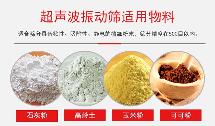 由于超聲波振動篩加裝了超聲波篩分系統(tǒng),適合篩分具備粘性、吸附性、靜電的精細粉末,篩分精度在500目以內,所以在篩分比較細的物料超聲波振動篩的還是站具很大得優(yōu)勢。