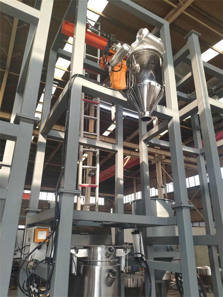 噸包投料站又稱噸袋拆包機,是用來實現(xiàn)袋裝散裝物料的卸料功能,為半自動操作。包裝袋由電動葫蘆提升,包裝袋的袋繩掛在鋼性支架上,手動操作控制葫蘆升降和行走,沿著行走導(dǎo)軌運行到卸料區(qū)上方落下,將包裝袋放置在支架托盤上,使大袋處于卸料位置。然后手動打開卸料閥操作門,人工將包裝袋的卸料口拉入到卸料閥的系口出,按下系帶按鈕,卸料閥束緊氣缸將袋口鎖緊,再手動將大袋的卸料口從卸料位置拉下,罩在卸料口密封箱內(nèi)的出料管外側(cè),按下壓袋機構(gòu)氣動控制開關(guān),使密封法蘭下降,并緊壓在出料管的管端,密封卸料通道,以防卸料過程中粉塵漏,接著,人工解袋,關(guān)上操作門。手動開啟與卸料口密封箱連接的通風(fēng)除塵管道上的閥門。至此,卸料準備過程結(jié)束。