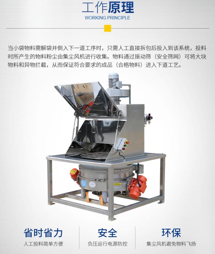 當小袋物料需要解袋并倒入下一道工序時,只需人工直接拆包后投入到該系統(tǒng),投料時所產生的物料粉塵由集塵風機進行收集。物料通過安全篩網(wǎng)可將大塊物料和異物攔截,從而保證符合要求的顆粒排出。該系統(tǒng)適用于制藥、化工、食品行業(yè)中小袋物的投放、篩分和卸料,特別適用于針對流動性較差物料的投料和篩分,拆包時由于集塵風機的作用,可以避免物料粉塵到處飛揚。