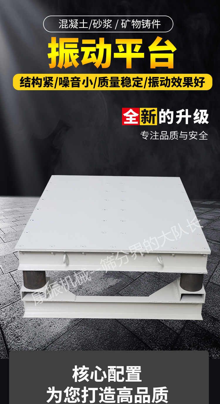 主要由臺(tái)底架、振動(dòng)電機(jī)和彈簧等部件組成,臺(tái)面與底架均用鋼板和型鋼焊接而成,振動(dòng)臺(tái)是用振動(dòng)電機(jī)加一對(duì)相同的偏心輪組成。