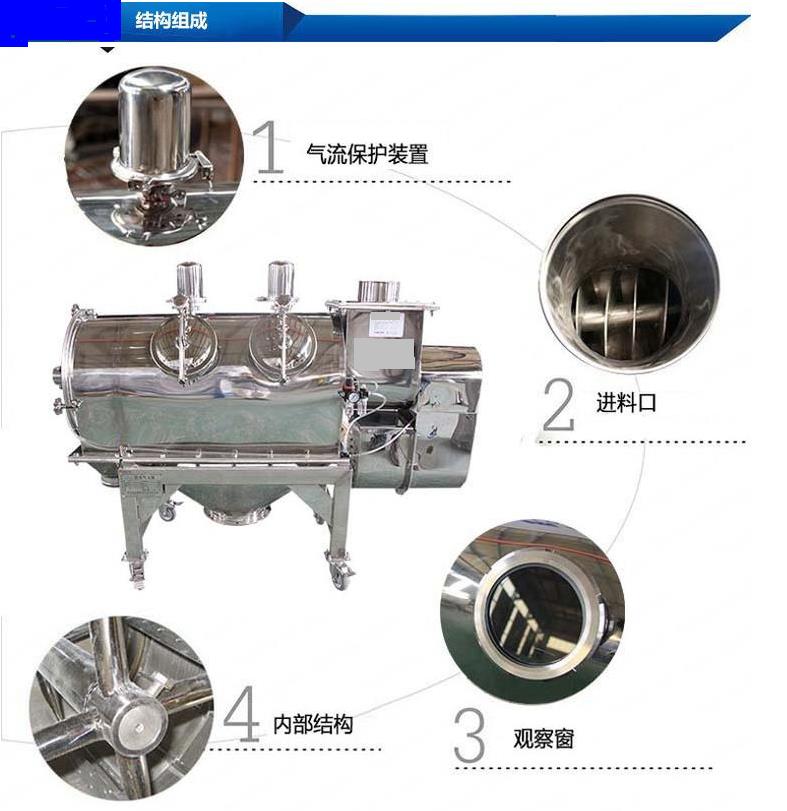 臥式氣流篩篩網(wǎng)為圓筒狀,置于機(jī)體內(nèi),物料通過(guò)螺旋輸送系統(tǒng)后,和氣流混合、霧化進(jìn)入網(wǎng)筒內(nèi);