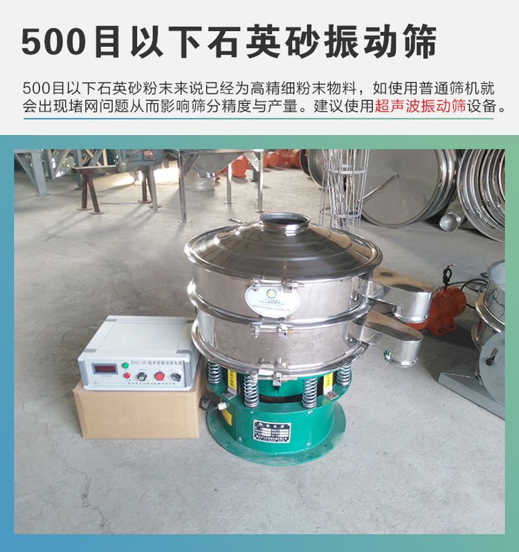 對(duì)于500目以下石英砂粉末來說已經(jīng)為高精細(xì)粉末物料,如使用普通篩機(jī)就會(huì)出現(xiàn)堵網(wǎng)問題從而影響篩分精度與產(chǎn)量。對(duì)于該類型的石英砂產(chǎn)品就需要使用到另一款篩分設(shè)備-超聲波振動(dòng)篩。該系列篩機(jī)的清網(wǎng)裝置使用的是超聲波系統(tǒng),開啟后篩面會(huì)形成一個(gè)高頻低振幅的超聲振動(dòng)波,使高精細(xì)粉末低空懸浮在篩面粗從而實(shí)現(xiàn)清網(wǎng)及解決堵網(wǎng)問題。