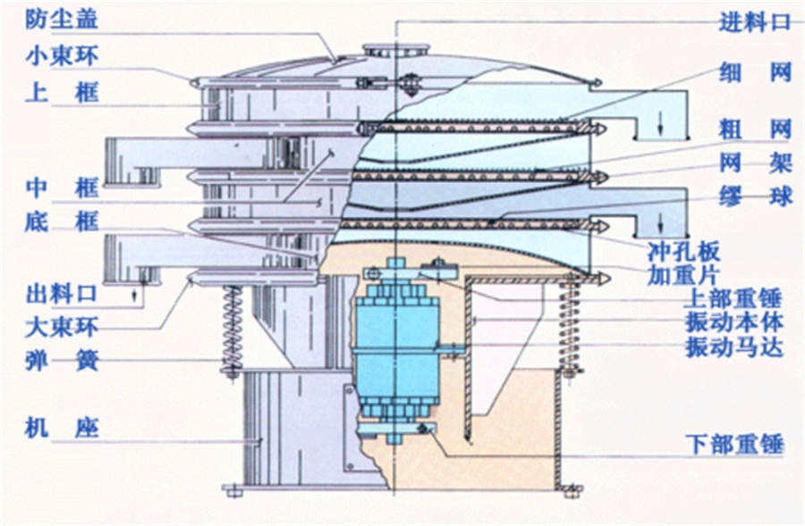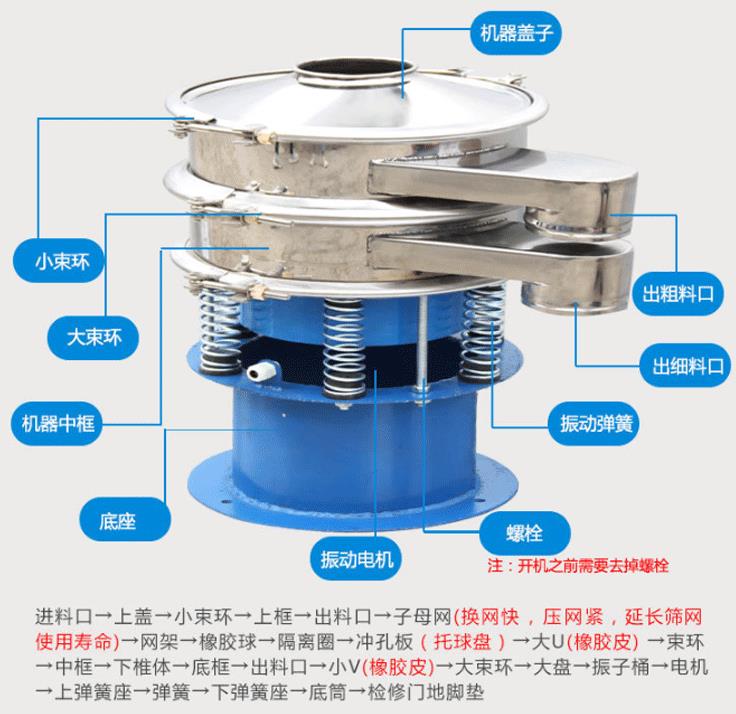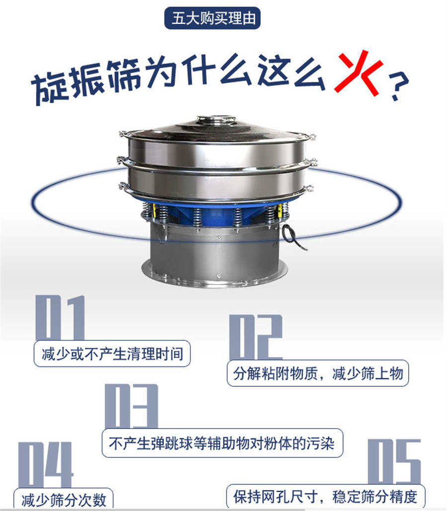 旋振篩是一種高精度細(xì)粉篩分機(jī)械,其噪音低、效率高,快速換網(wǎng)只需3-5分鐘,全封閉結(jié)構(gòu),適用于粒、粉、粘液等物料的篩分過濾。旋振篩是由直立式振動(dòng)電機(jī)作激振源,電機(jī)上、下兩端安裝有偏心重錘,將電機(jī)的旋轉(zhuǎn)運(yùn)動(dòng)轉(zhuǎn)變?yōu)樗?、垂直、傾斜的三次元運(yùn)動(dòng),再把這個(gè)運(yùn)動(dòng)傳遞給篩面。調(diào)節(jié)電機(jī)上、下兩端的相位角,可以改變物料在篩面上的運(yùn)動(dòng)軌跡。